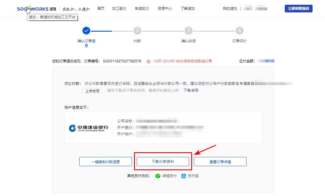 7. 點(diǎn)擊【下載付款資料】,可獲取對公轉(zhuǎn)賬信息